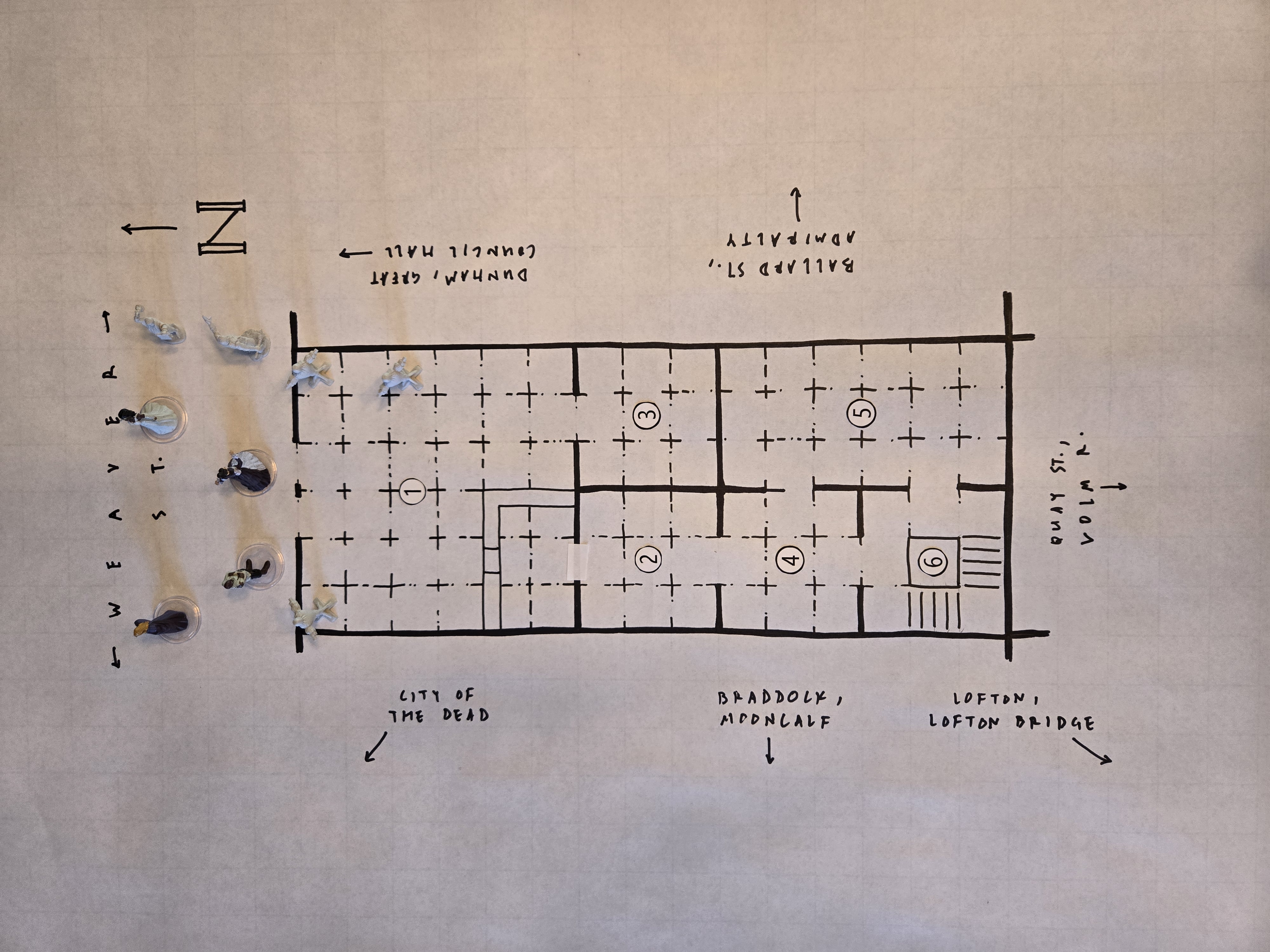 In their previous game, the party found that Mooncalf owner Miss Miller had killed the Master of Revels Helmholtz and the Admiralty Secretary Parja, and that her butchers were grinding Helmholtz up into sausage. They found Miss Miller in a pipe dream in the Mooncalf opium dens and confronted her about the murders. However, Miss Miller waved them off, saying that the Mooncalf historically had a "liberty" that prevented the Company from enforcing its laws there.