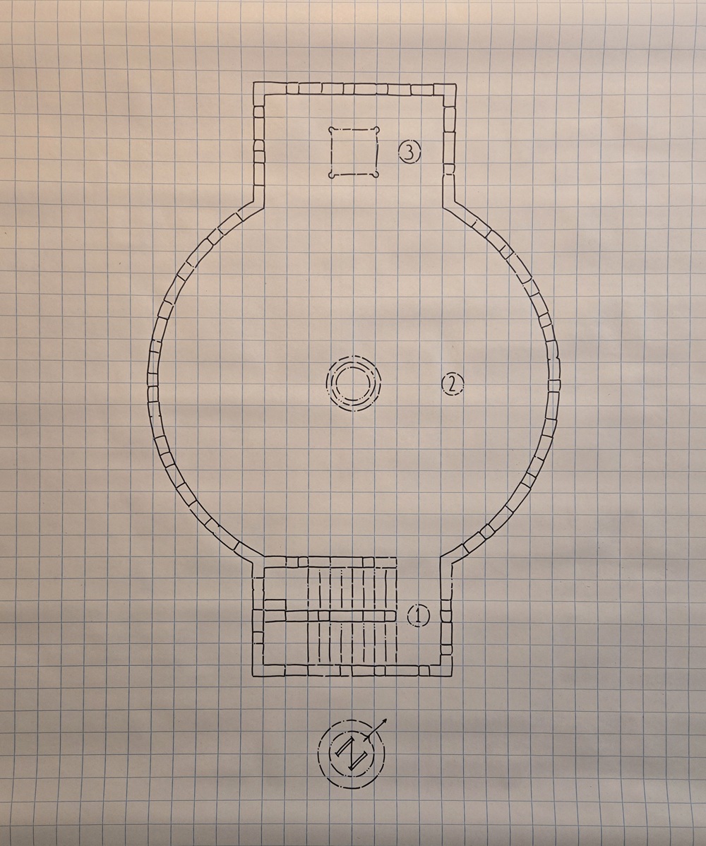 In contrast to the open-air courtyard (1), this room has a high dome as a ceiling. In the center of the room, under the dome, there was a stone casket on a high platform. However, the platform and casket have been pushed over onto the floor. The casket lays open, and a skeleton has rolled out of the casket onto the floor.