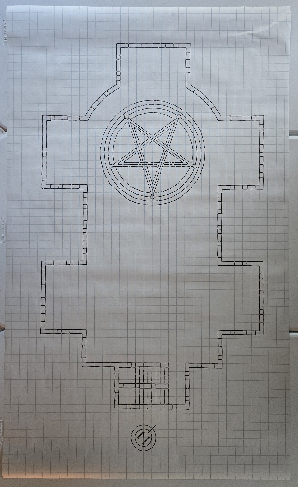 The party continued down toward the third basement, where they expected to find Bullington and Stella Brock. As they turned the stair corner they saw a gently pulsating blue light in the doorway and heard faint singing. When they arrived at the basement, they saw a floorplan similar to the previous one, but with a giant 70-foot pentagram on the floor at the far end.