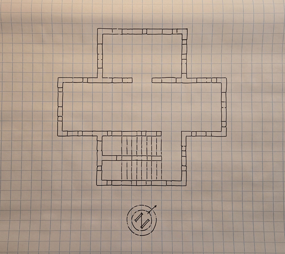 As the party exits the stairs onto this level, they find themselves in a crypt crowded with different burials and memorials.