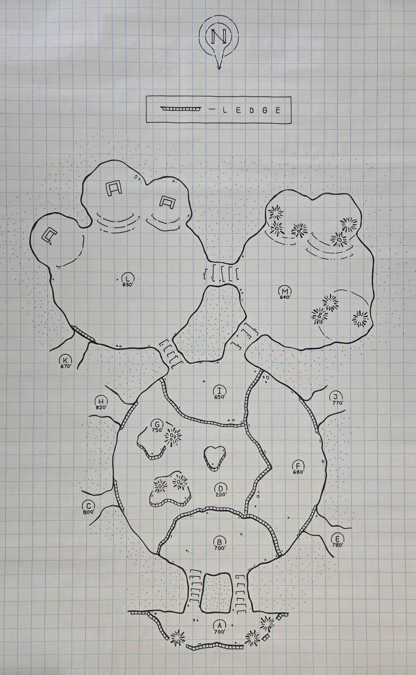 They went inside, to B. There they found plateaus (F, I) and tunnels and very different elevations (C, E, H, J). But in particular, they immediately noticed the area in the middle of the cavern - the "bone well" D - was 500 feet lower than B. Looking over the ledge, they saw thousands of bones of the harpies' victims had been discarded there over time.