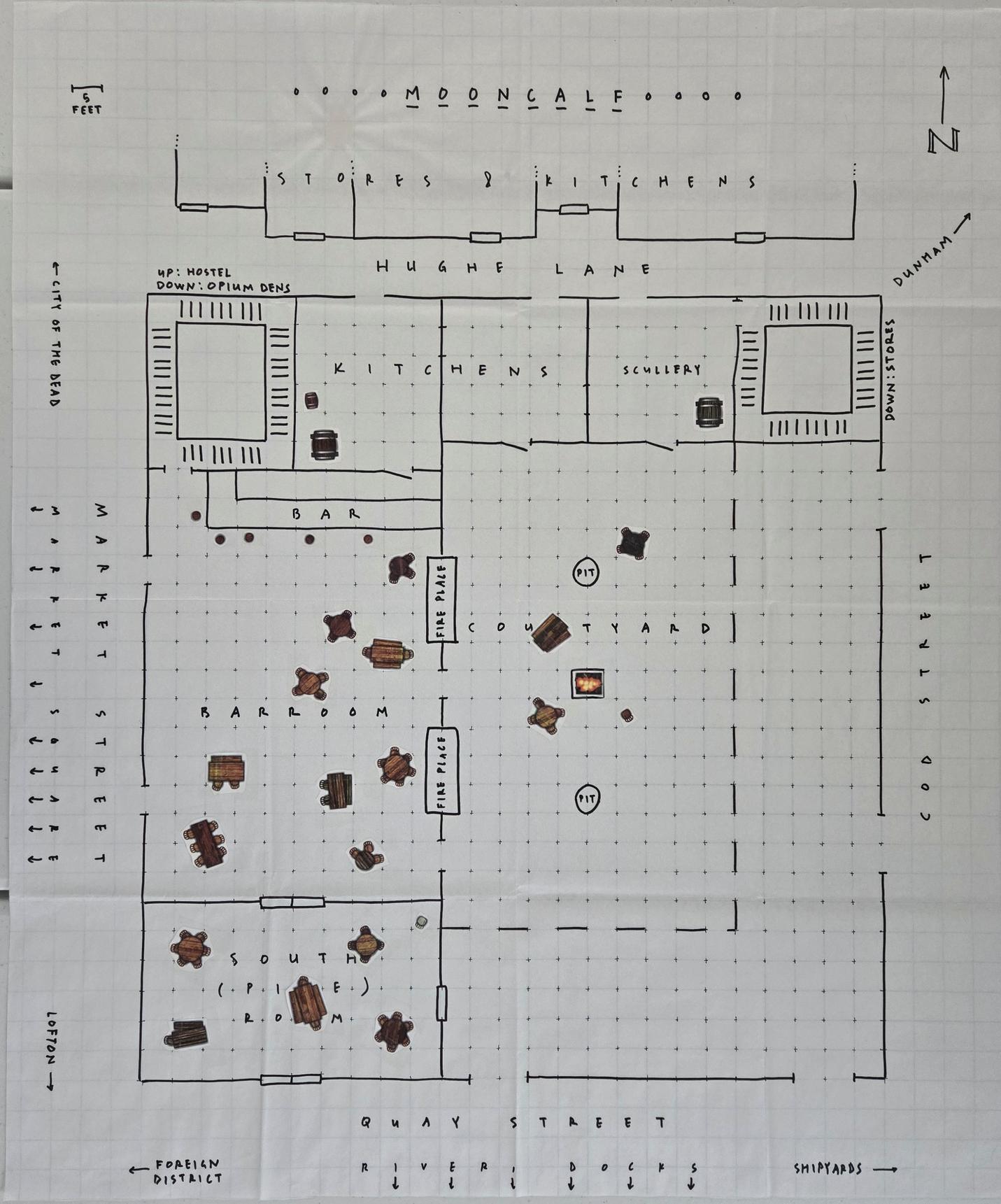 The Mooncalf is large - its footprint is large and it has six floors above ground. The ground floor is the tavern, with an open courtyard, a barroom, and a pipe room for enjoying a smoke. It also has a few basements, including a labyrinth of opium dens that's famous worldwide.