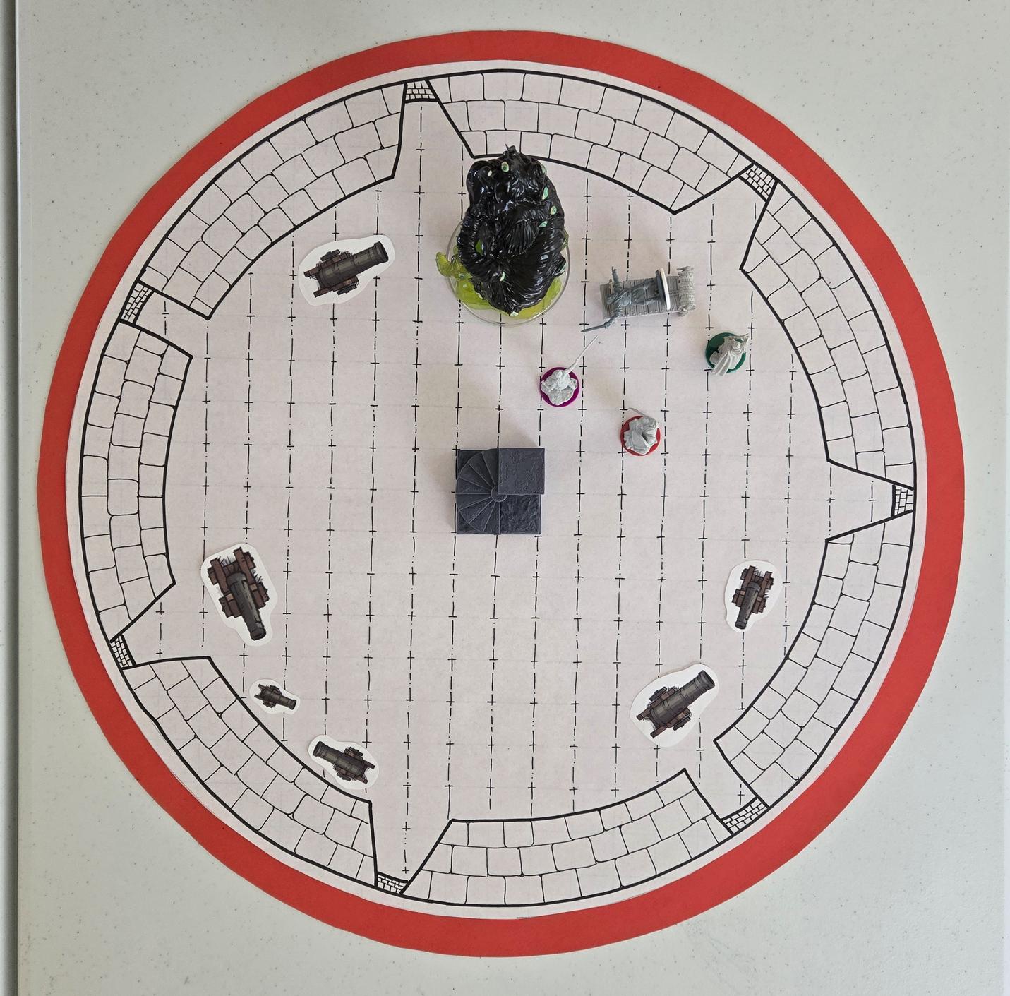 On the first round, Kiltak hit the globster's tank with his weapon and damaged it a little, but then realized they could try a cannon instead. I pointed out that Kiltak had found a package of gunpowder in Game 6. We decided it would take four actions to use the cannon: one move action to aim it, and three standard actions to figure it out, load it, and fire it. We also decided that the cannon would destroy the tank without an attack roll, but explode on a 1. Elgis, Kiltak, and Virgil each did different cannon actions on their turns to get it done faster.