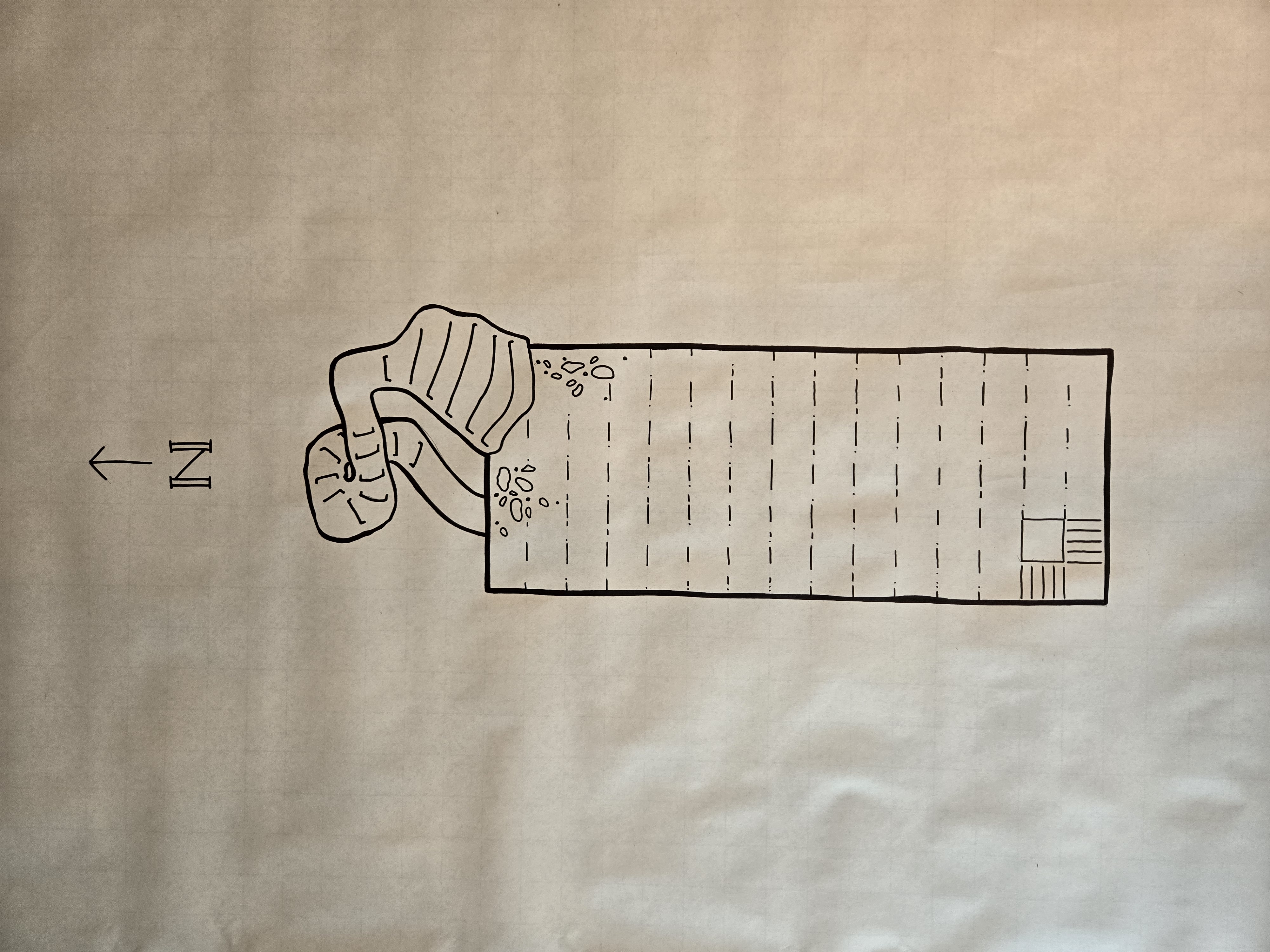 The stair ends on this floor, it doesn’t go down any further. You exit the room into a large room, 30 feet x 75 feet.