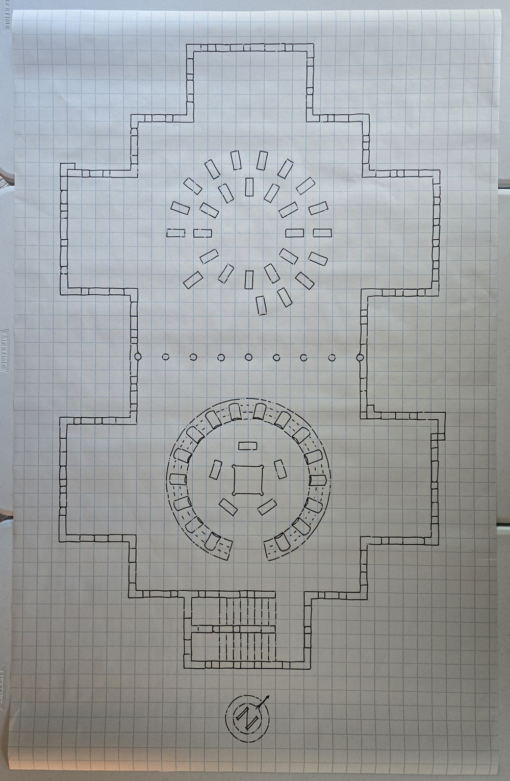 Five chairs are loosely arranged around the altar. On a couple of the chairs, there are piles of beige dust, partially on the seat of the chair and partially on the ground around the chair, maybe about a gallon of dust in all.