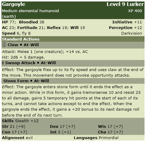 Zephyr had the stats of a level 9 gargoyle, including Fly 8 and the Gargoyle's Swoop Attack power. He was also Insubstantial, and had the powers Howling Wind and Lightning.