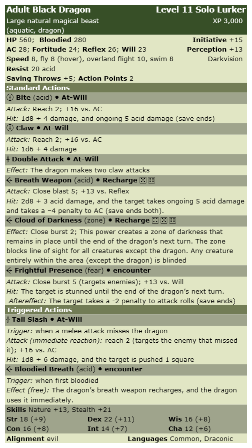 My notes don't say what Marwolaeth's stats were, but Keith's notes show him starting with 280 hits, so I think he had the stats of an Adult Black Dragon with half hits.