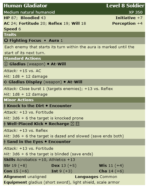 Alim had these statistics and his gladiators had these statistics. Hadi had these statistics and his other inquisitors had these statistics. The party and their gladiator allies defeated Alim's men and the Directorate, and Ord avoided sanctioning.